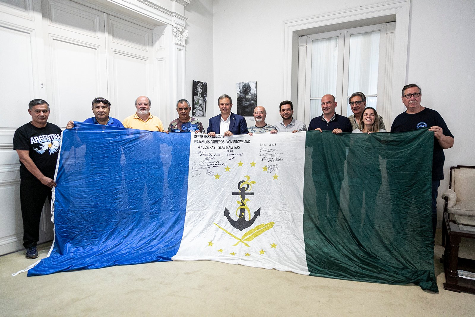 La jornada se llevó adelante en el Palacio Municipal, donde las autoridades recibieron por parte de los héroes brownianos Sergio Pérez, Roberto Yucheri, Julio Bogado y Roberto González, una bandera que hicieron flamear en nuestras islas.