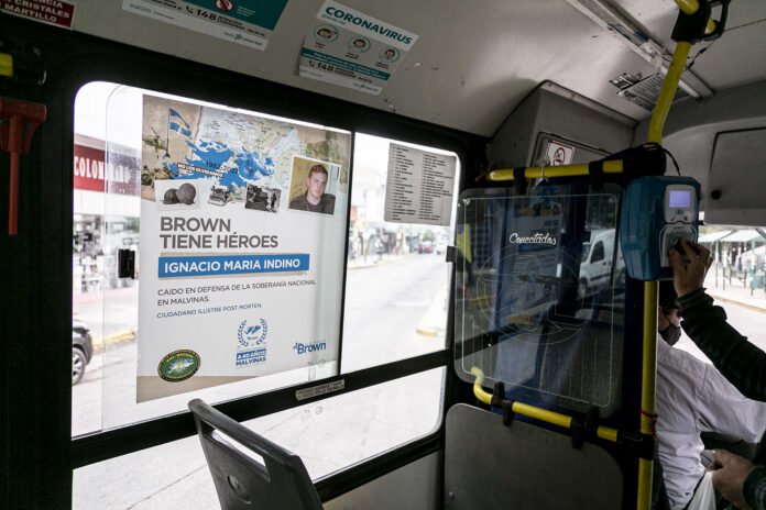 El Municipio de Almirante Brown colocó carteles conmemorativos con la imagen de los cinco héroes de Malvinas que entregaron su vida en defensa de la Soberanía Nacional hace cuatro décadas. Los afiches, instalados en el marco de los homenajes y las actividades por el 40° aniversario de la Guerra de Malvinas, ya están pegados en las ventanas en las unidades de las líneas locales de colectivos.