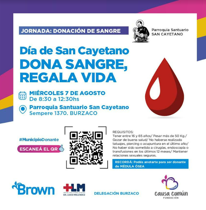 El Municipio de Almirante Brown, a través de la Fundación Causa Común, informó que llevará adelante el miércoles 7 de agosto una nueva jornada de donación de sangre en el marco del Día de San Cayetano, patrono del pan y del trabajo, en la localidad de Burzaco.