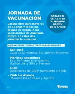 El Municipio de Almirante Brown sumará este sábado 17 de julio cuatro nuevos vacunatorios itinerantes en las localidades de San José, Malvinas Argentinas y Glew, los cuales se incorporarán a los nueve Centros de Vacunación fijos que funcionan en la Comuna, en el marco del programa “Buenos Aires Vacunate”.