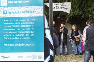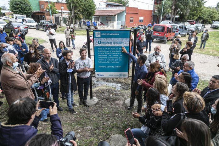 En el lugar, familiares de las víctimas, vecinos, militantes y funcionarios del Municipio participaron de la señalización del “sitio de la memoria”, con el descubrimiento del cartel para el recuerdo permanente en el barrio, en una tarea articulada con el gobierno de la Provincia de Buenos Aires, el Municipio, organizaciones políticas sociales y organismos ligados a la memoria y los derechos humanos.