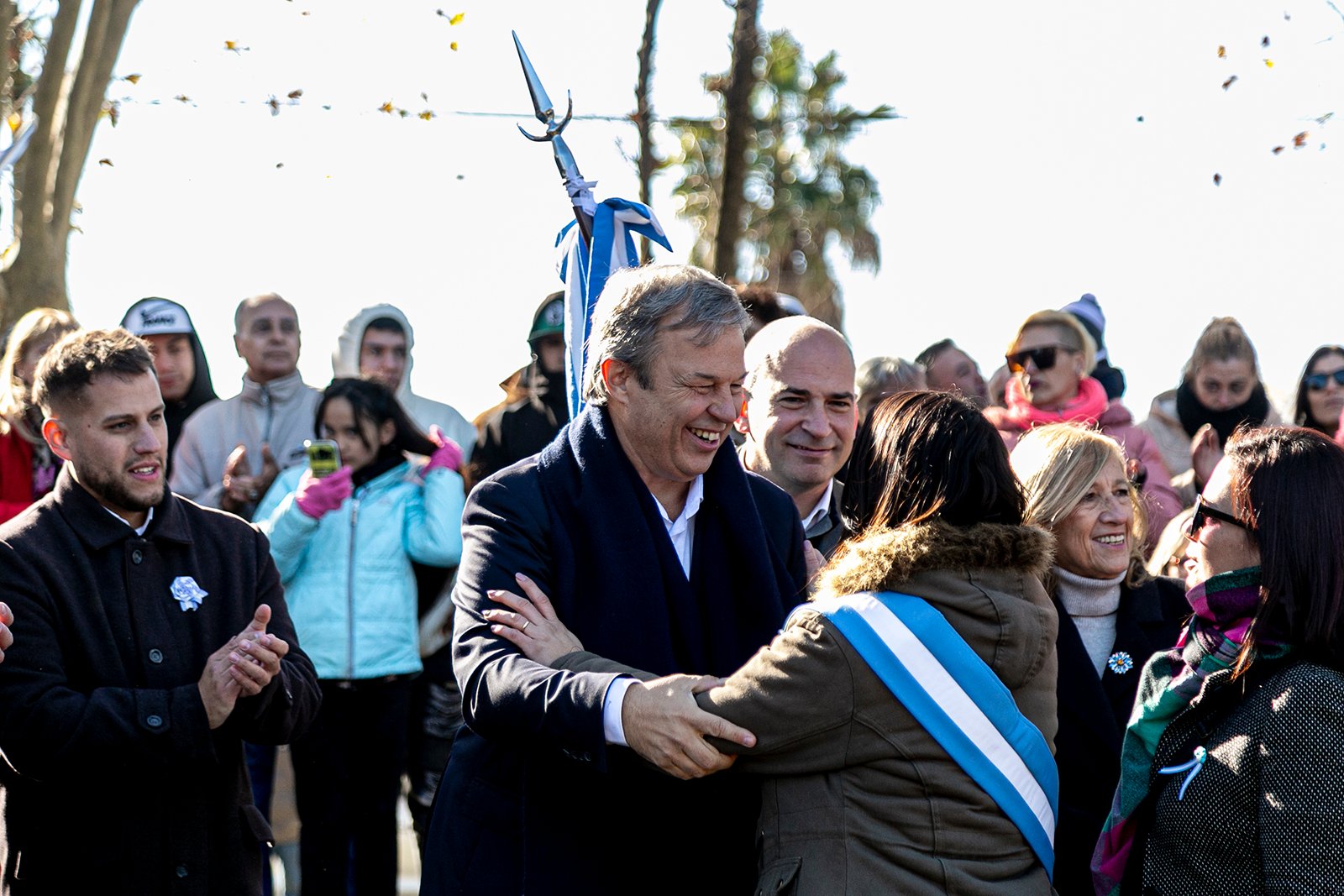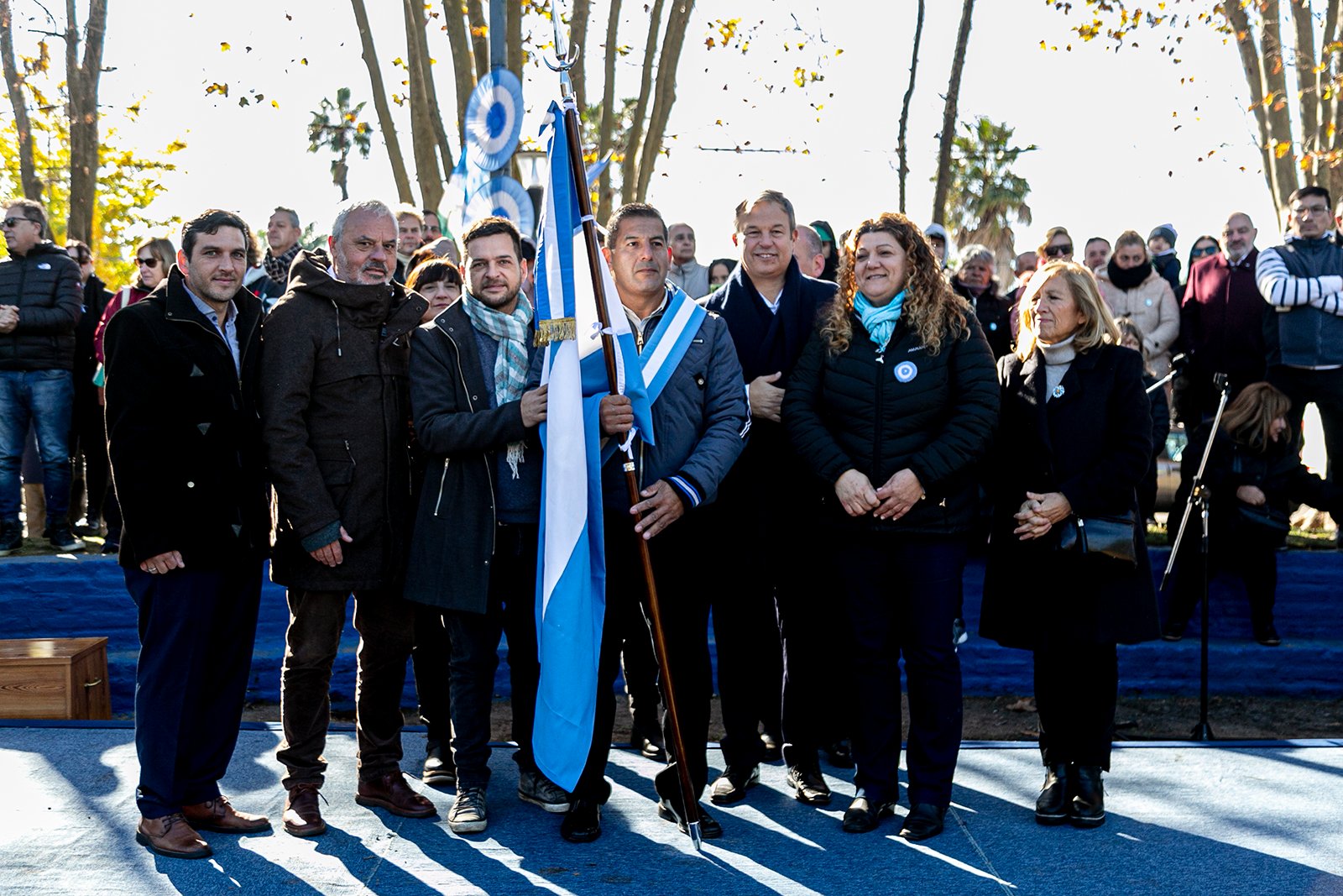 En un acto lleno de banderas celestes y blancas, la ceremonia oficial se realizó por la mañana en la Plaza 25 de Mayo ubicada entre las calles Colón, Martín Arin, Lavalle y Rivadavia, y comenzó con una previa artística folklórica con la actuación de la Compañía “Danzares Buenos Aires” a cargo de los profesores Lucía Gutiérrez y Guillermo Vivas.