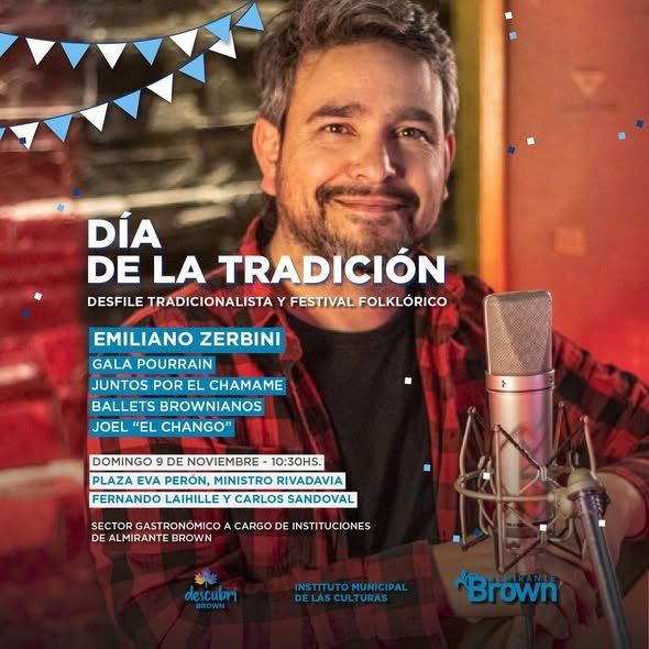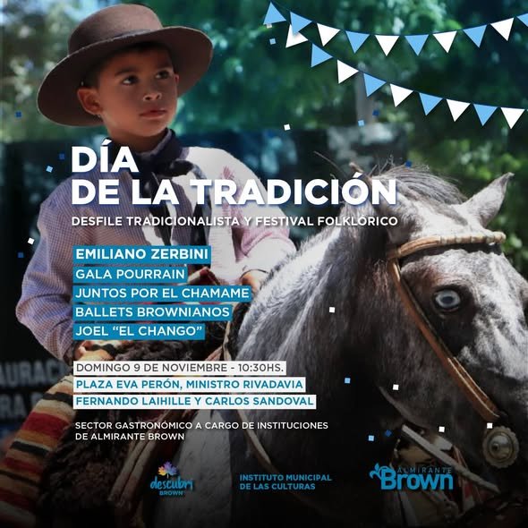 El Municipio de Almirante Brown invita a los vecinos a participar de las actividades organizadas en el marco del Día de la Tradición, que se celebrarán el sábado 8 y domingo 9 de noviembre con propuestas artísticas y folklóricas en Burzaco y Ministro Rivadavia.