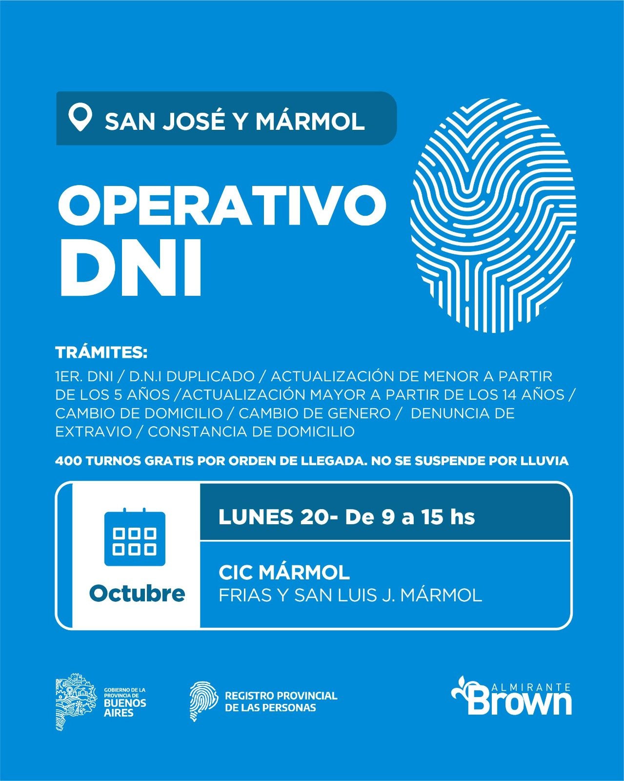 El Municipio de Almirante Brown, que conduce Mariano Cascallares, informó que en articulación con el Gobierno Bonaerense llevará adelante un nuevo operativo de documentación del lunes 20 al viernes 24 de octubre acercando importantes servicios a las localidades de José Mármol, Rafael Calzada, San Francisco de Asís, Burzaco y Glew.