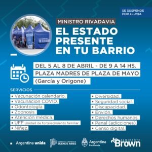 El Municipio de Almirante Brown desembarcará con el programa El Mercado en tu Barrio este martes 5, miércoles 6, jueves 7 y viernes 8 en la Plaza Madres de Plaza de Mayo (calles García y Origone) de la localidad de Ministro Rivadavia.