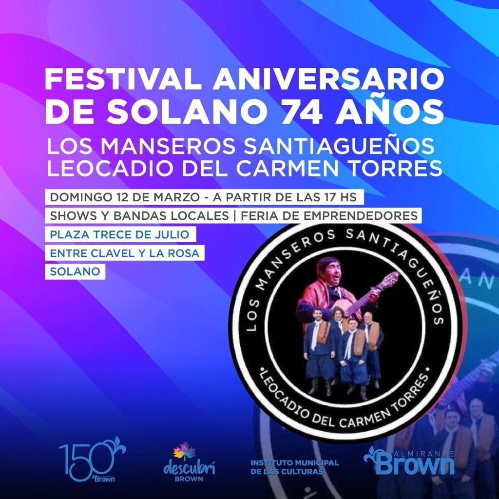 El Municipio de Almirante Brown llevará adelante este sábado 11 y domingo 12 de marzo los festejos por los 74 años del origen de la localidad de San Francisco Solano, los cuales incluirán la presentación de «Los Charros» y «Los Manseros Santiagueños», además de la participación de bandas locales y la presencia de la Feria de Emprendedores brownianos.