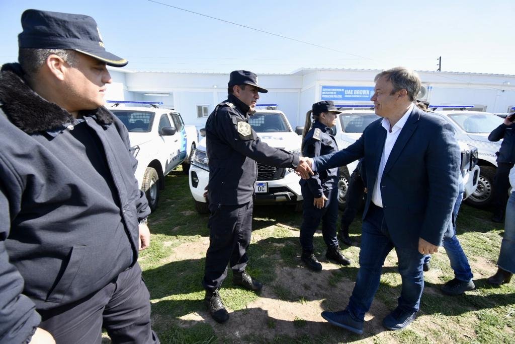 Mariano Cascallares y Juan Fabiani presentaron ayer en la Unidad Académica Externa (UAE) del Instituto Juan Vucetich en Ministro Rivadavia, 40 nuevos móviles policiales para reforzar el patrullaje y la prevención del delito en los barrios y en las localidades de Almirante Brown.