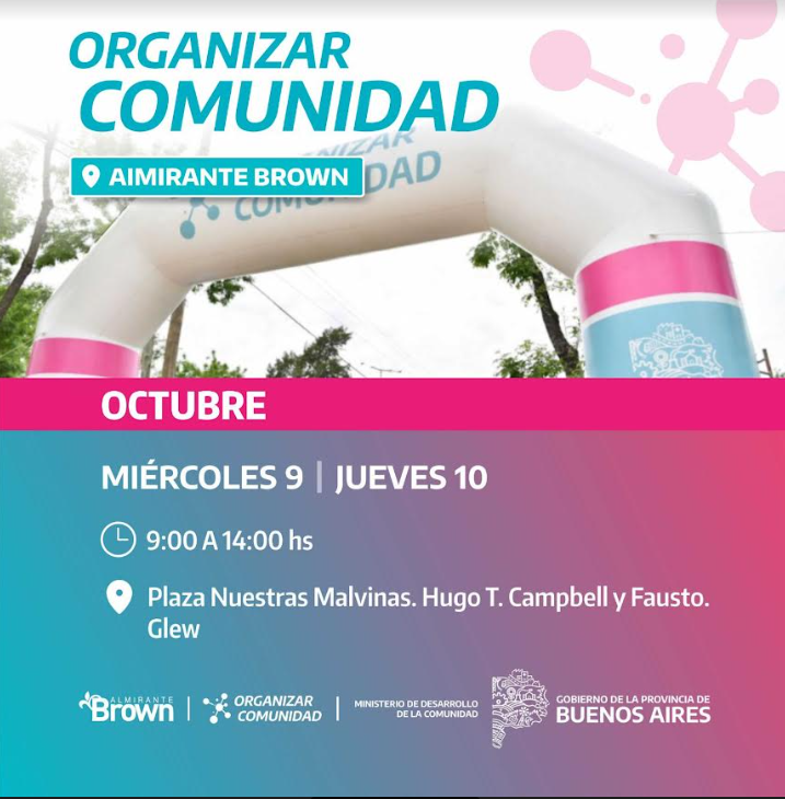 El Municipio de Almirante Brown informó que mañana miércoles 9 y el jueves 10 de octubre llegará a la localidad de Glew el dispositivo territorial “Organizar Comunidad” que recorre los diferentes municipios de la Provincia de Buenos Aires con el objetivo de que las vecinas y vecinos puedan acceder a diversos servicios.
