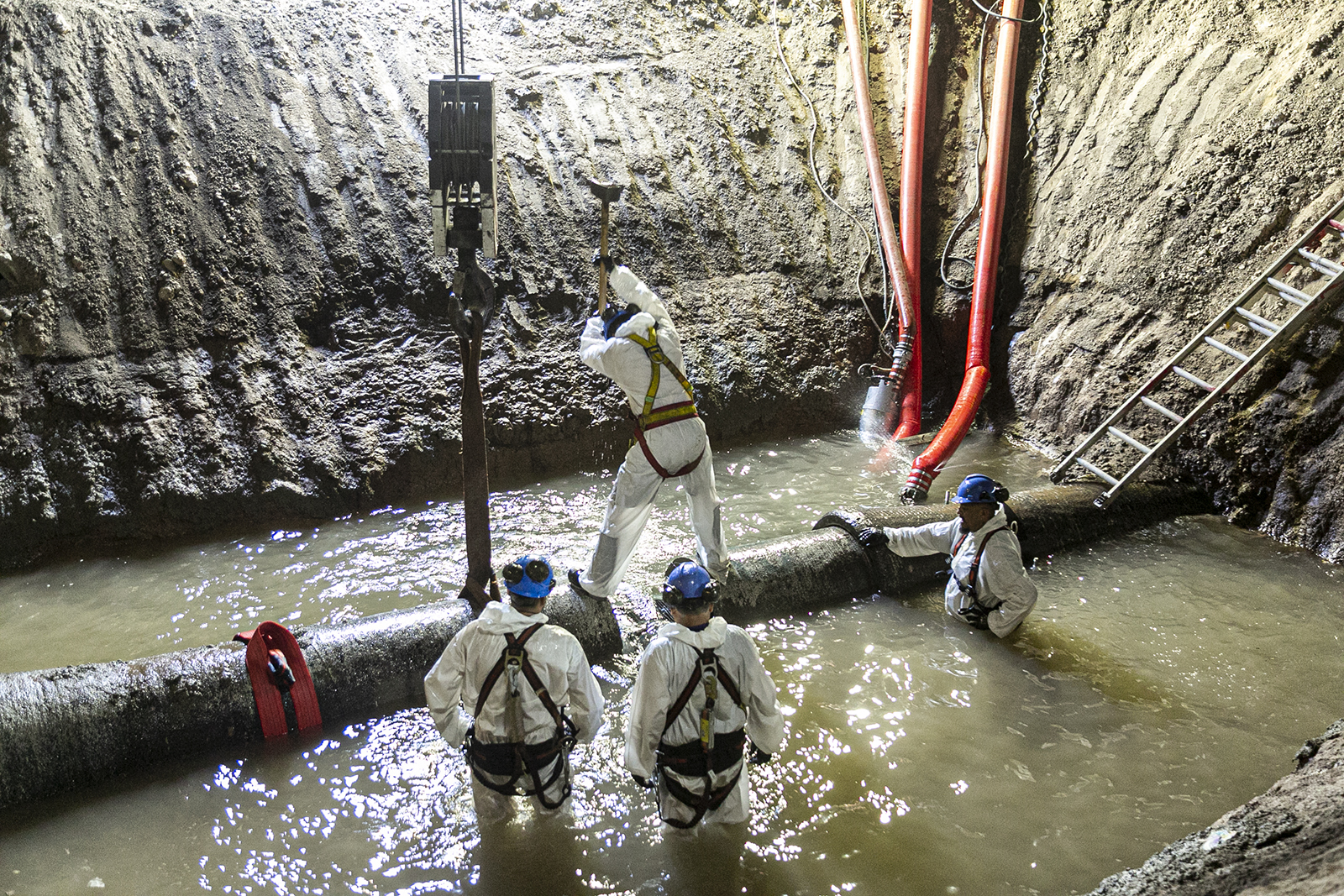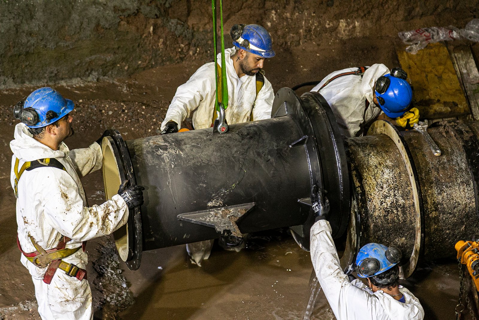 Los trabajos tuvieron que ver con el desvío y posterior empalme de una cañería de distribución de 600mm de diámetro que estaba ubicada debajo de la rotonda en la intersección de la avenida Hipólito Yrigoyen y la Ruta 4, la cual imposibilitaba terminar con el proceso de excavación del túnel vehicular, y que fue elevada a nivel del suelo dentro de unas canaletas de hormigón.