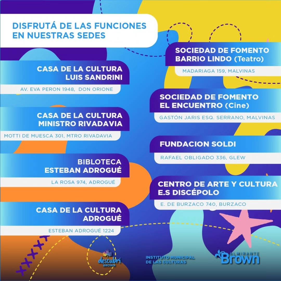 Las sedes disponibles para disfrutar de todas estas actividades son las Casas de la Cultura de Adrogué, Ministro Rivadavia y Don Orione; la Biblioteca Municipal Esteban Adrogué, la Fundación Soldi, el Centro de Arte «Enrique Santos Discépolo» de Burzaco y las Sociedades de Fomento “Barrio Lindo” y “El Encuentro” de Malvinas Argentinas.