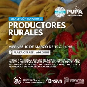 El Municipio de Almirante Brown informó que este viernes 10 de marzo vuelve la Feria de Productores Rurales a la Plaza Cerreti de Adrogué con más productos, precios accesibles y nuevos beneficios para las vecinas y los vecinos de nuestro distrito.