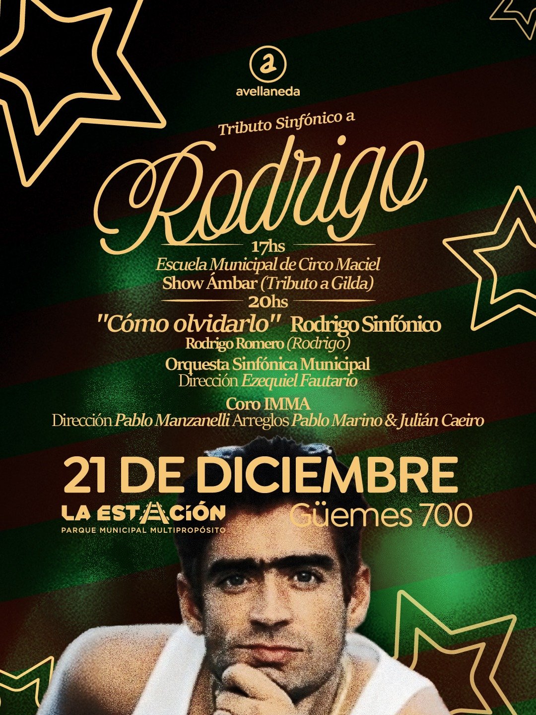 El domingo 21, a las 20 hs, vamos a compartir el “Tributo Sinfónico a Rodrigo”. En este caso se presenta el show «Cómo olvidarlo”, protagonizado por Rodrigo Romero y la Orquesta Sinfónica de Avellaneda, dirigida por Ezequiel Fautario.
