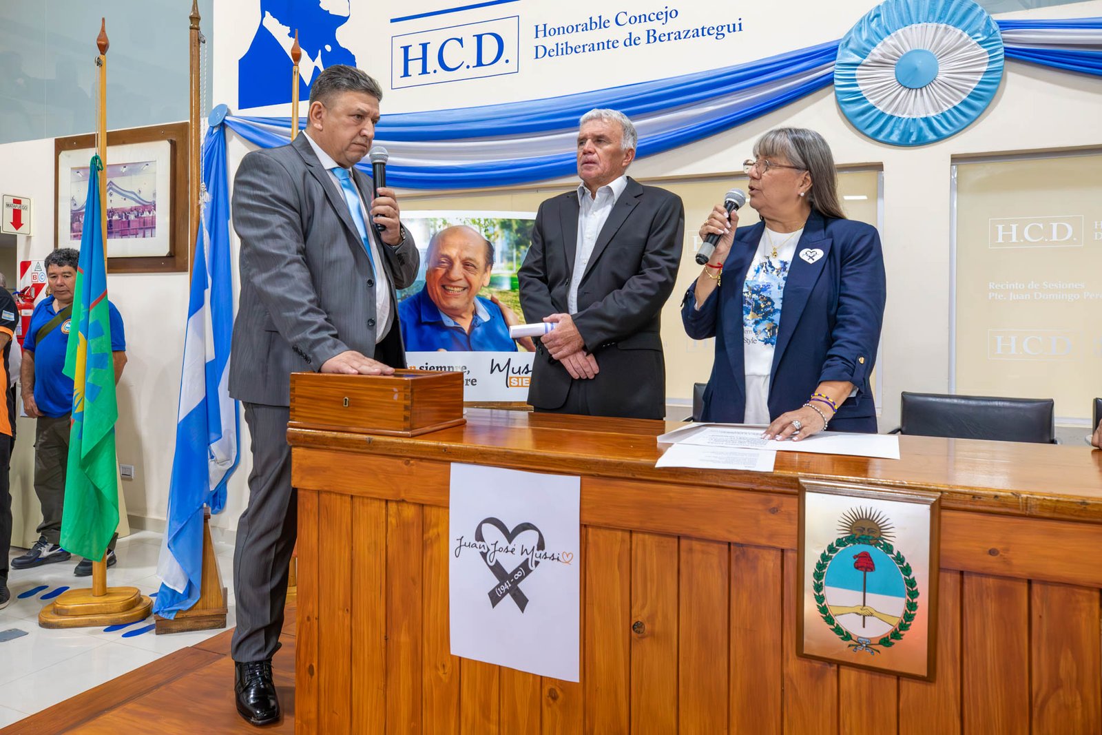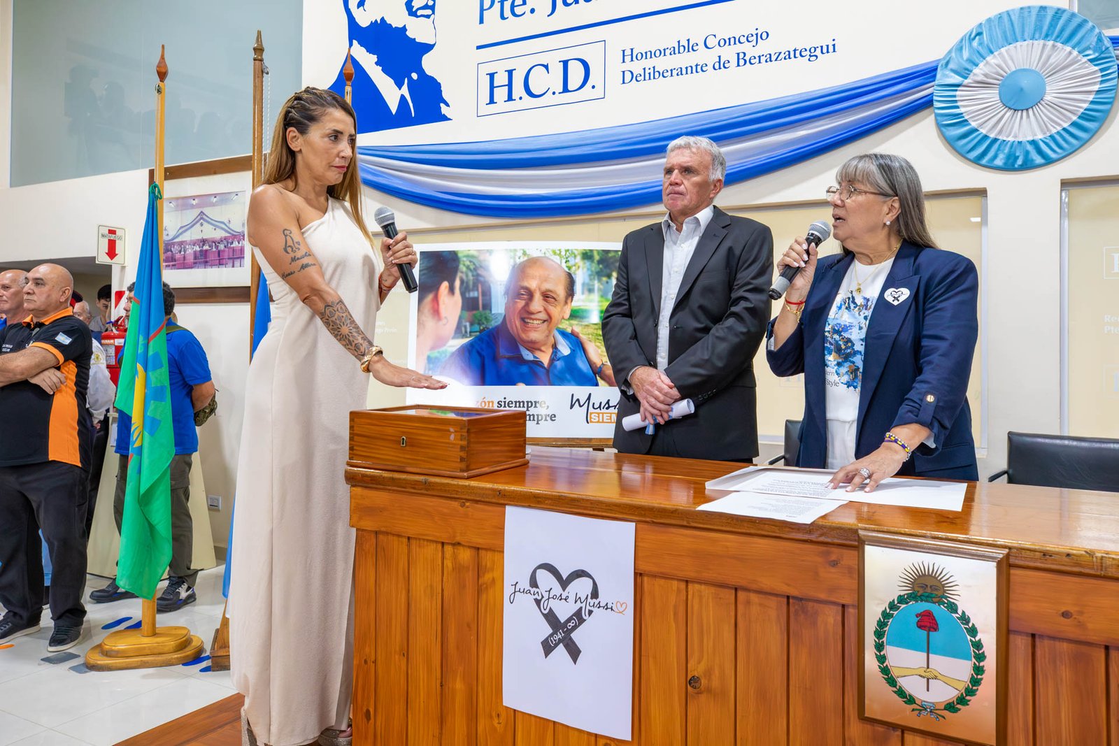 A continuación, en uno de los tramos más emotivos de su discurso, recordó: “Hoy se cumplen 38 años de la primera vez que Juan José Mussi asumió como Intendente. Un hecho que cambió para siempre la historia de Berazategui. Quienes caminamos a su lado, sabemos que nos enseñó a gobernar con cercanía, sensibilidad y a trabajar incansablemente. Durante las casi cuatro décadas que lo acompañé, vivimos crisis durísimas y también tiempos de crecimiento y esperanza. Y siempre, en cada uno de esos momentos, él estuvo sosteniendo a su pueblo”.