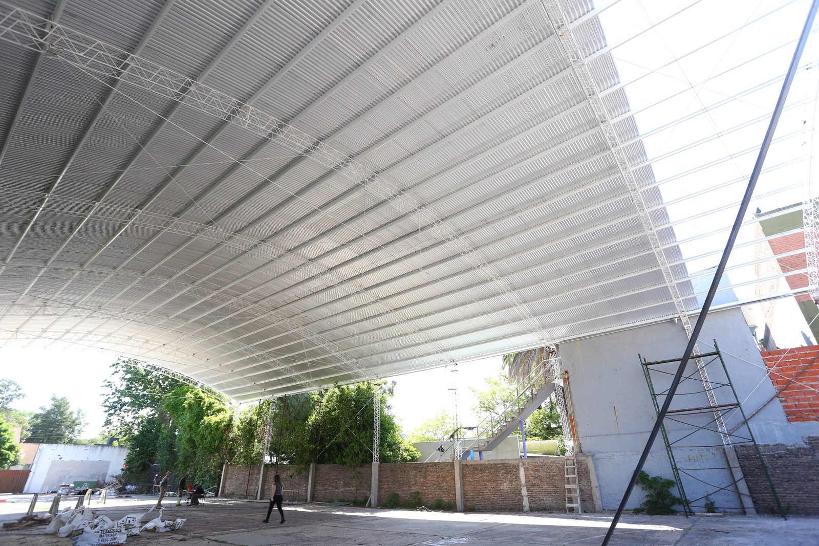 La obra consiste en el armado de un techo parabólico tradicional con cubierta de chapas cincalum sobre perfilería galvanizada y vigas reticuladas que tienen apoyo en bases y columnas de hormigón armado. A su vez, los trabajos contemplan la construcción de los desagües pluviales, la instalación eléctrica para la iluminación LED interior y la pintura del playón deportivo del patio.