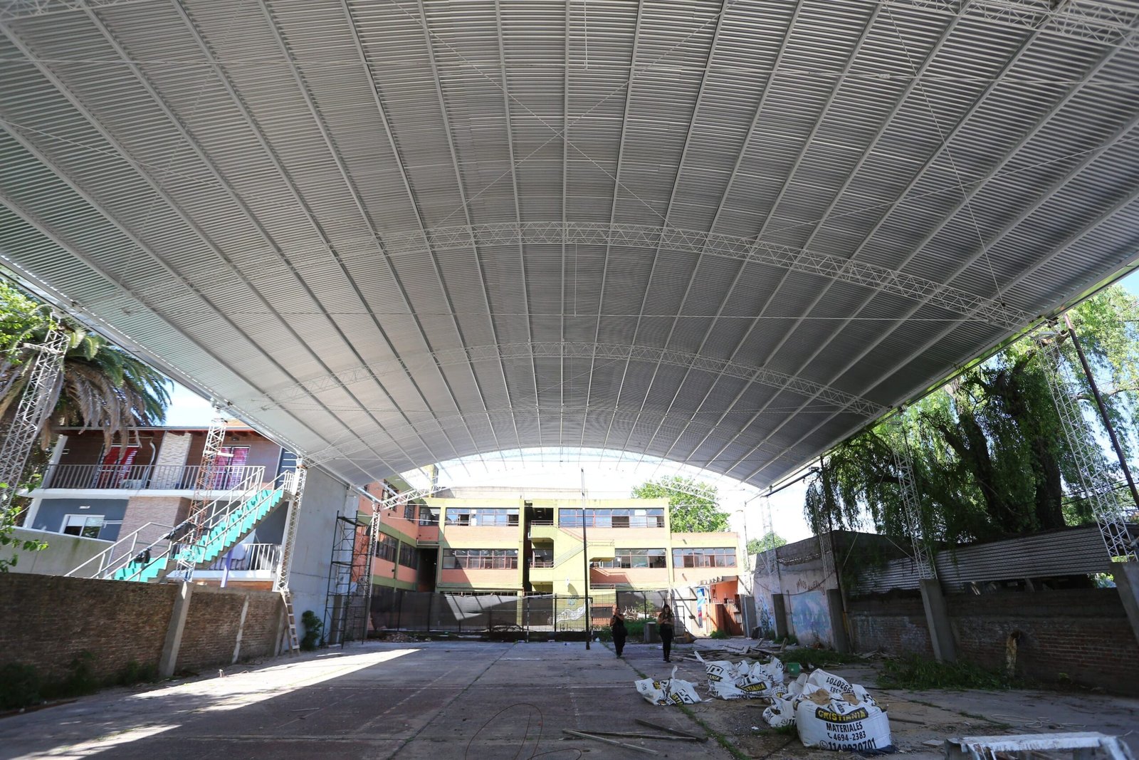 El Municipio de Esteban Echeverría avanza con la construcción de un techo parabólico en el patio del establecimiento donde funcionan la Escuela Secundaria N° 12 Mariano Saavedra y la Escuela Secundaria N° 14 Francisco Muñiz, en Monte Grande. La nueva estructura permitirá que las chicas y los chicos cuenten con mejores condiciones para la práctica deportiva.