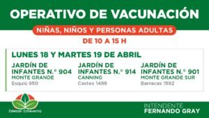 El Municipio de Esteban Echeverría continúa con los operativos territoriales de vacunación destinados a quienes deban completar el esquema dispuesto por el Calendario Nacional. También están disponibles las dosis antigripales para niñas y niños de 6 a 24 meses de edad.