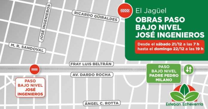 El Municipio de Esteban Echeverría realizará tareas de mantenimiento en el paso bajo nivel de la calle José Ingenieros, que une Dardo Rocha con Fray Luis Beltrán, en el barrio Altos de Monte Grande (El Jagüel). Debido a los trabajos, el cruce permanecerá cerrado al tránsito vehicular desde las 7 horas del sábado 21 de diciembre hasta las 19 horas del domingo 22.