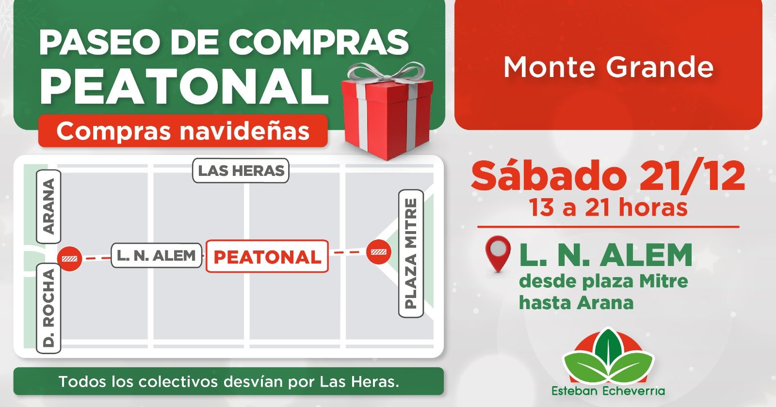 El sábado 21 de diciembre, de 13 a 21 horas, la calle L. N. Alem —en el centro de Monte Grande— se transformará en peatonal con el objetivo de fomentar la actividad comercial antes de Navidad. El paseo de compras abarcará desde la calle Arana hasta la plaza Mitre. Además de los locales de diversos rubros, las familias podrán disfrutar de la oferta gastronómica de food trucks.