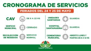 El Municipio de Esteban Echeverría informa cómo funcionarán los servicios de salud, el Centro de Atención al Vecino (CAV) y la recolección de residuos, durante el fin de semana largo debido a los feriados del lunes 24 y martes 25 de mayo.