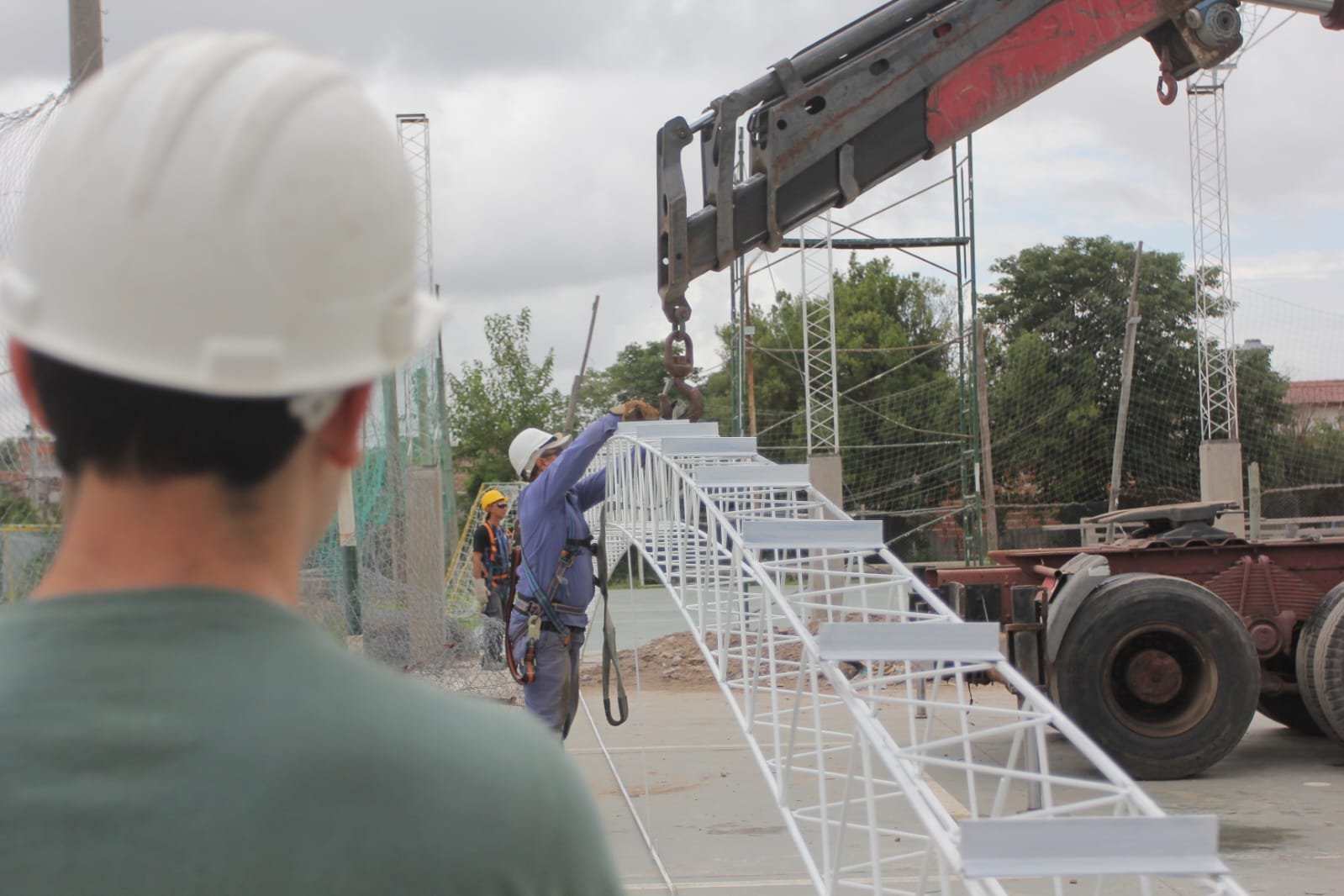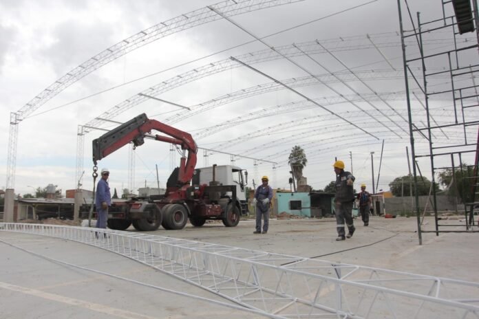 Los trabajos incluyen el armado de un techo parabólico tradicional con cubierta de chapas cincalum sobre perfilería galvanizada y vigas reticuladas que tienen apoyo en bases y columnas de hormigón armado.
