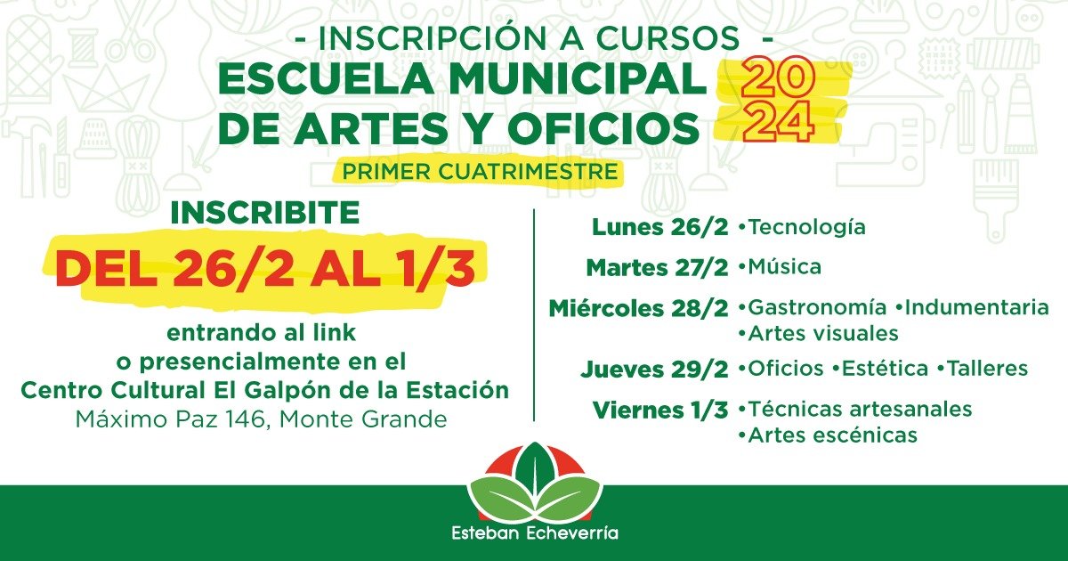 Desde el lunes 26 de febrero hasta el viernes 1° de marzo se encuentra abierta la inscripción para los cursos gratuitos de la Escuela Municipal de Artes y Oficios de Esteban Echeverría que comenzarán la semana del 18 de marzo.