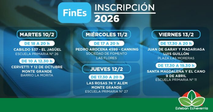 El Municipio de Esteban Echeverría sigue adelante con la inscripción para el Plan FinEs 2026, destinado a mayores de 18 años que deseen terminar sus estudios secundarios o rendir materias adeudadas. La modalidad es presencial, en sedes descentralizadas y con horarios flexibles.