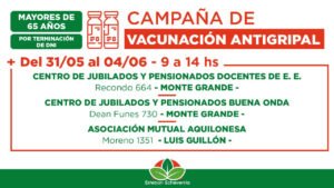 Así, desde el lunes 31 de mayo hasta el viernes 4 de junio, de 9 a 14 hs, las y los adultos mayores podrán aplicarse la vacuna en la Asociación Mutual Aquilonesa (Moreno 1351), en Luis Guillón; el Centro de Jubilados y Pensionados Docentes de Esteban Echeverría (Recondo 664) y el Centro de Jubilados y Pensionados Buena Onda (Deán Funes 730), en la localidad de Monte Grande.