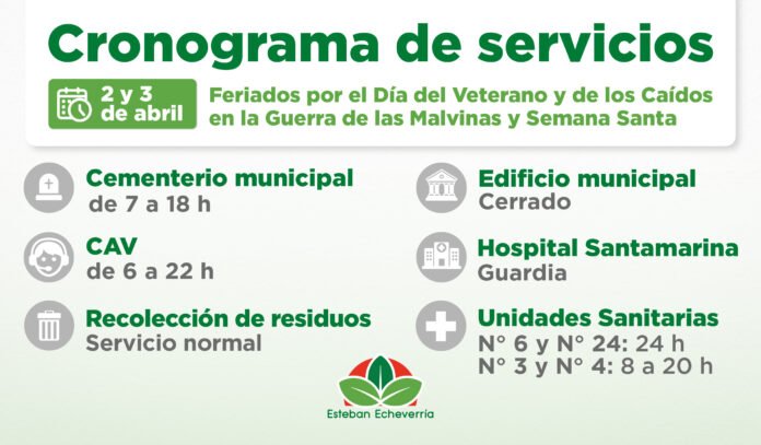 El Municipio de Esteban Echeverría informa el cronograma de servicios públicos durante los feriados del jueves 2 y viernes 3 de abril, con motivo del Día del Veterano y de los Caídos en la Guerra de las Malvinas y Semana Santa.