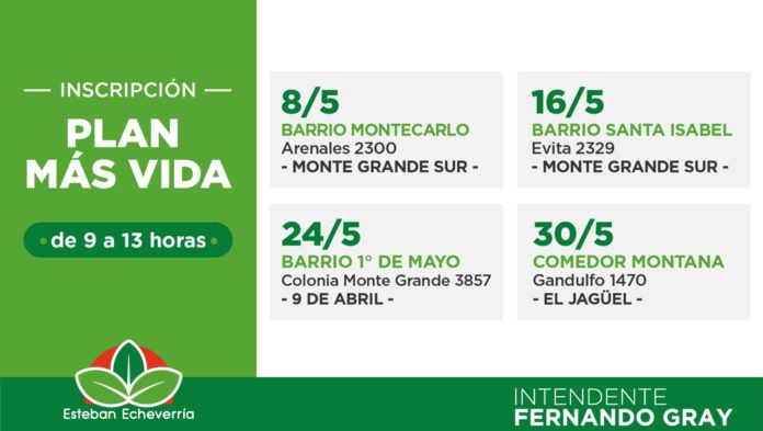 Durante mayo, el Municipio de Esteban Echeverría realizará operativos de inscripción al Plan Más Vida. El programa está dirigido a familias con niñas y niños de 0 a 6 años y personas gestantes en período de embarazo que no cuenten con la Tarjeta Alimentar.