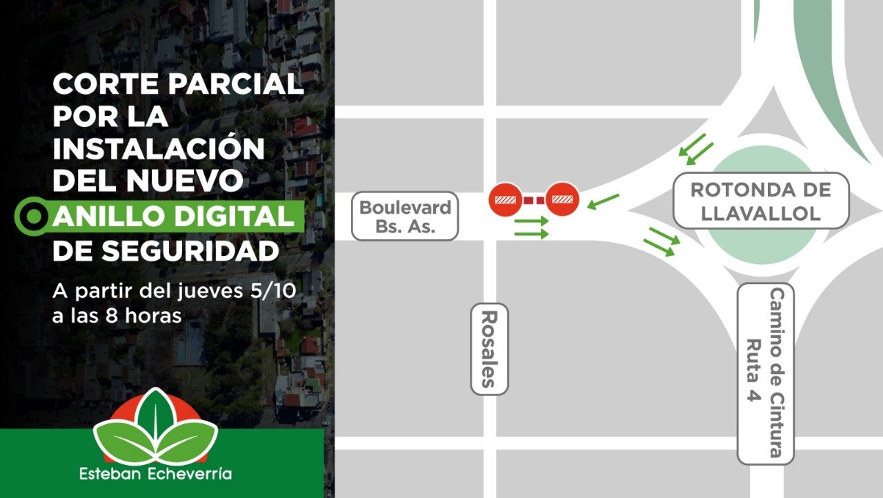 El jueves 5 de octubre, a partir de las 8 horas, se realizará un corte parcial de calzada en la intersección de avenida Boulevard Buenos Aires y la calle Rosales, mano hacia la calle Bourquet. En esa esquina, el Municipio de Esteban Echeverría comenzará la instalación del primer arco del Anillo Digital de Seguridad, un sistema de cámaras lectoras de patentes que identifica a los vehículos que utilizan las entradas y salidas del distrito.