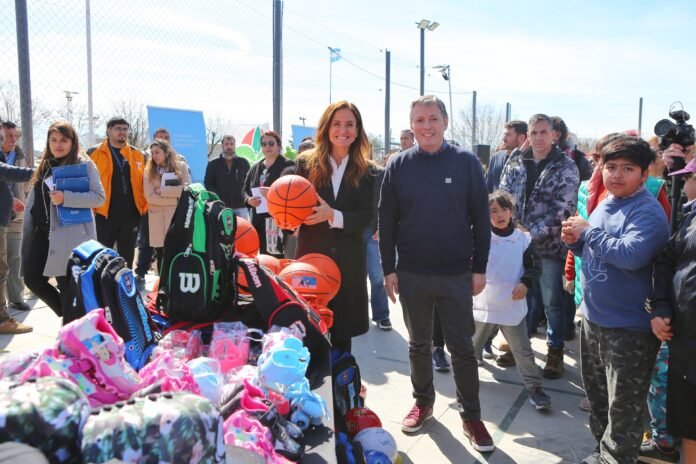 En el marco de la inauguración, Gray y Tolosa Paz entregaron gorras, pelotas de fútbol y básquet, patines, mochilas y zapatillas a las vecinas y los vecinos allí presentes.