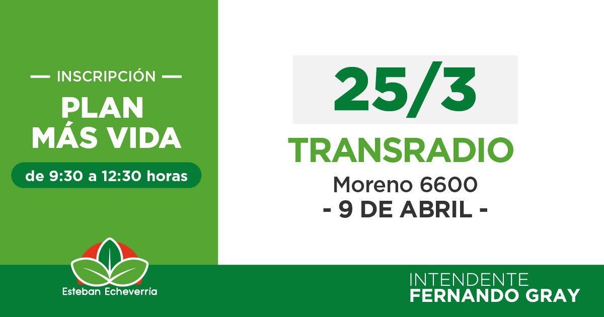 El Municipio de Esteban Echeverría realizará una jornada de inscripción al Plan Más Vida el lunes 25 de marzo de 9.30 a 12.30 horas en Moreno 6600 (Transradio, 9 de Abril). El programa está destinado a familias con niñas y niños hasta 6 años de edad y personas gestantes en período de embarazo que no reciban la Tarjeta Alimentar.