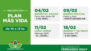 Las jornadas se llevarán adelante de 10 a 13 hs, el viernes 4 de febrero en Cerro San Javier 50, El Zaizar, en la localidad de 9 de Abril. Continuarán la siguiente semana, el miércoles 9, en Colón y Azul, Barrio Policial, Monte Grande. También el viernes 11, en Quiroga 2320, Loma Verde, El Jagüel, y el viernes 18, en Garreador 727, 9 de Abril.