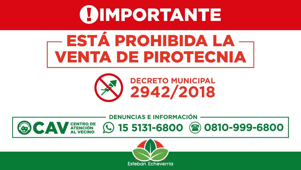 El Municipio de Esteban Echeverría informa que se encuentra prohibida la venta de pirotecnia en puestos fijos y ambulantes. Las personas que adviertan la presencia y el funcionamiento de puntos de venta de pirotecnia pueden comunicarse al Centro de Atención al Vecino (CAV) al 0810 999 6800 o, por WhatsApp, al 15 5131 6800.
