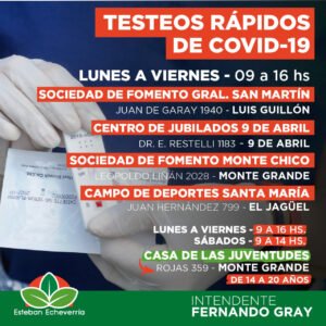 Con el fin de detectar casos positivos de covid-19, el Municipio de Esteban Echeverría continuará esta semana con los operativos de testeo rápido en distinto puntos del distrito, una estrategia sanitaria que permite identificar y aislar rápidamente los casos positivos.