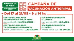 Con el fin de reducir las complicaciones que genera el virus influenza, las adultas y adultos mayores pueden acercarse a partir del lunes 17, de 9 a 14 hs, a las postas de salud ubicadas en el Centro de Jubilados y Pensionados Dulce Edad, Ascasubi 483, Monte Grande; Centro de Jubilados y Pensionados Villa Mayo, M. Coronado 945, Luis Guillón; Sociedad de Fomento El Zaizar, L. Vernet 4091, 9 de Abril, y en la Sociedad de Fomento El Jagüel, A. Nervo 628.