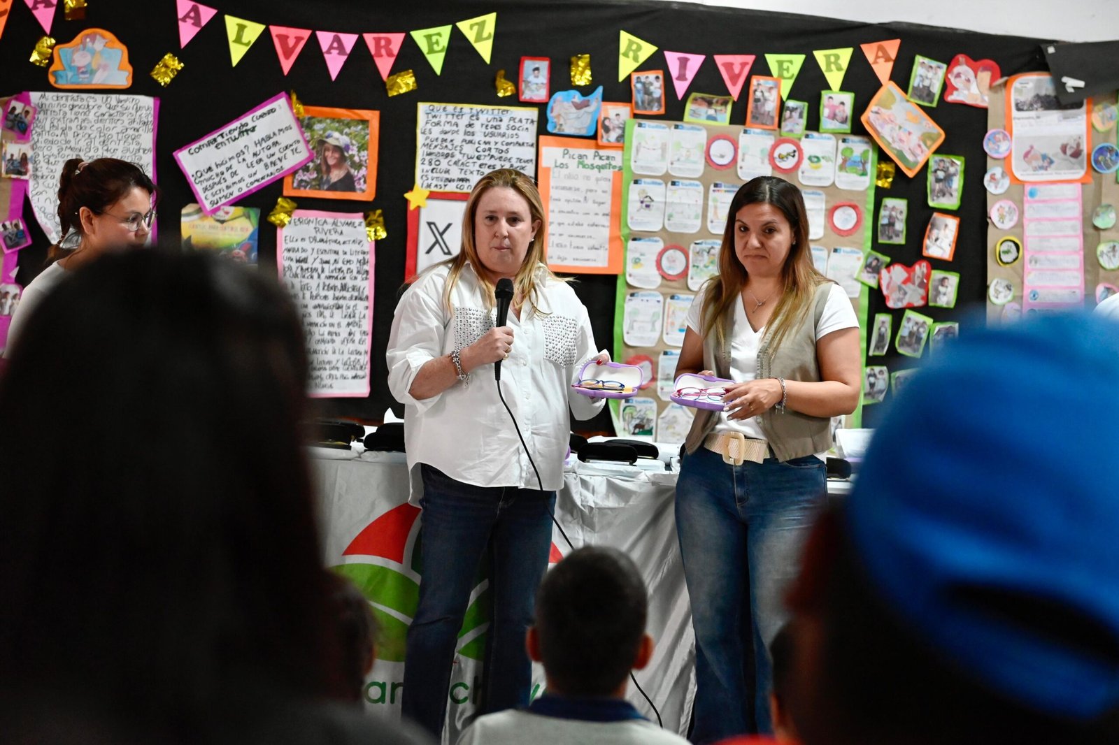 El equipo de trabajo del Municipio de Esteban Echeverría, junto con Magui Gray y la secretaria de Gobierno, Valeria Bellizzi, entregaron 186 pares de lentes a estudiantes de 1° y 2° año de las escuelas primarias N° 7 de Monte Grande y N° 56 de 9 de Abril.