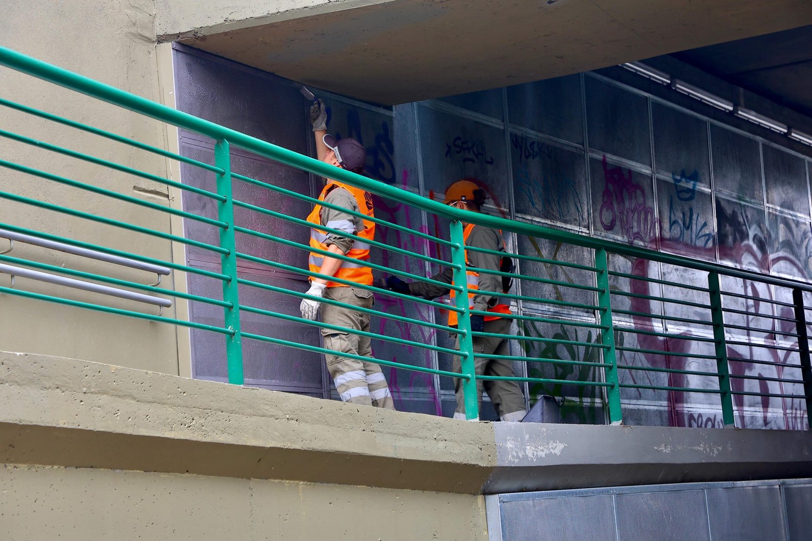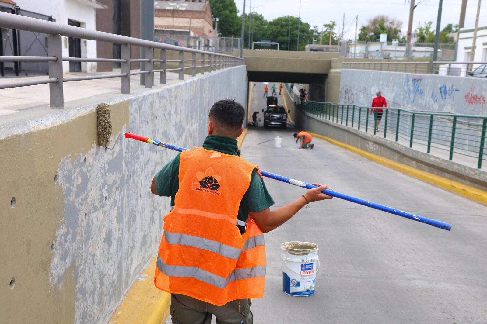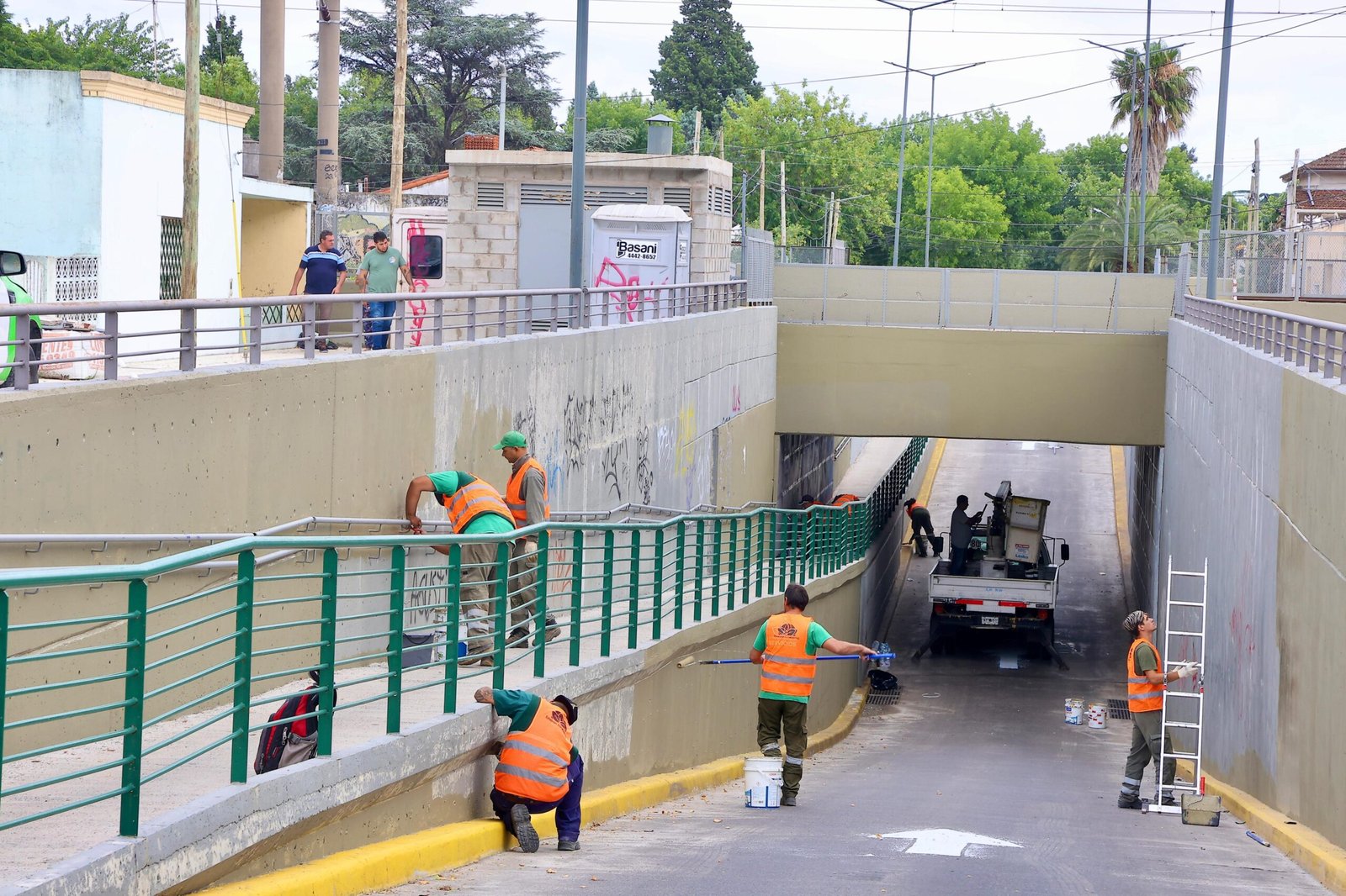 Los equipos llevan adelante tareas de pintura integral en todo el paso bajo nivel, por un total de 350 metros cuadrados, incluida la demarcación vial correspondiente. Previamente, se realizó una limpieza profunda y se hidrolavaron paredes, pisos, pasarelas, barandas y veredas. Además, se repararán las luminarias led.