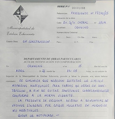 La Municipalidad de Esteban Echeverría tomó medidas tras las reiteradas quejas de los residentes del Barrio El Centauro, en la localidad de Canning. A través de una intimación formal, el gobierno local exigió a los responsables de una obra privada el cumplimiento estricto de las normativas vigentes, particularmente en lo que respecta a los horarios de trabajo.