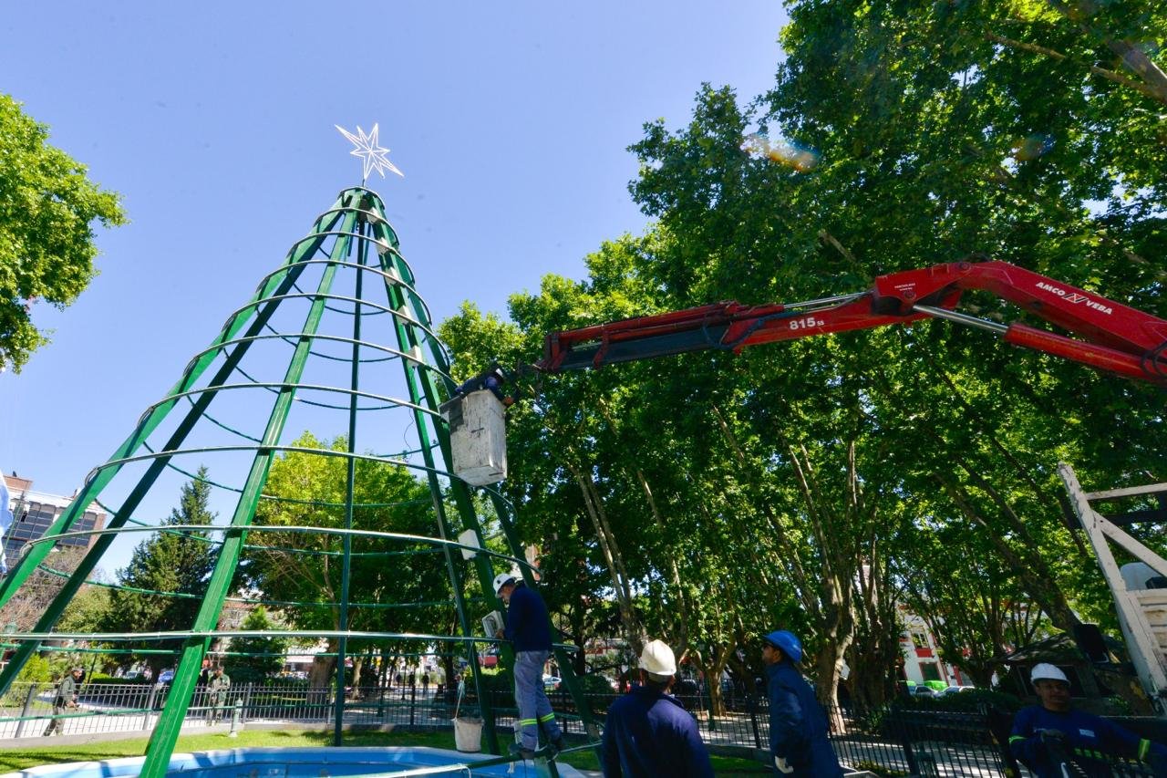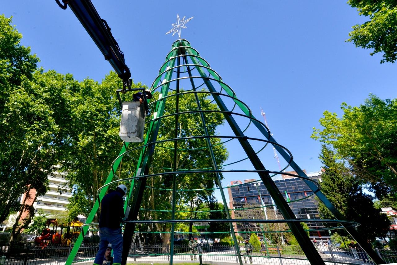 El Municipio de Esteban Echeverría avanza con el armado del tradicional árbol de Navidad en la plaza Mitre de Monte Grande, frente al edificio municipal.