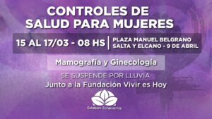 En el marco del Mes de la Mujer, el Municipio de Esteban Echeverría junto con la Fundación Vivir es Hoy, encabezará operativos gratuitos de control de salud para mujeres. Se realizarán desde mañana martes 15 al jueves 17 de marzo desde las 8 de la mañana, en la Plaza Manuel Belgrano, ubicada en Salta y El Cano, de 9 de Abril. La jornada se suspende por lluvia.