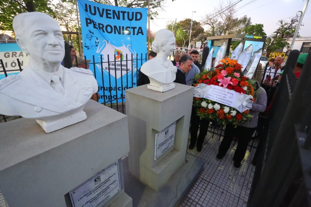 En el marco de la conmemoración del Día de la Lealtad Peronista, el intendente de Esteban Echeverría, Fernando Gray, colocó una ofrenda floral en los monumentos de Evita y Juan Domingo Perón que se encuentran en la plaza de la Cultura (El Jagüel).