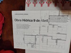 Como detalle, de acuerdo a lo indicado, se están dando obras que se superponen a un planeamiento originario, ya que la capa asfáltica nueva de calle Colón es complementada por cruces de caños muy chicos y de plástico, buscando forzar al agua a correr en forma paralela a Ruta 4, cosa que no pasa por haber una pendiente hacia esta zona problemática.