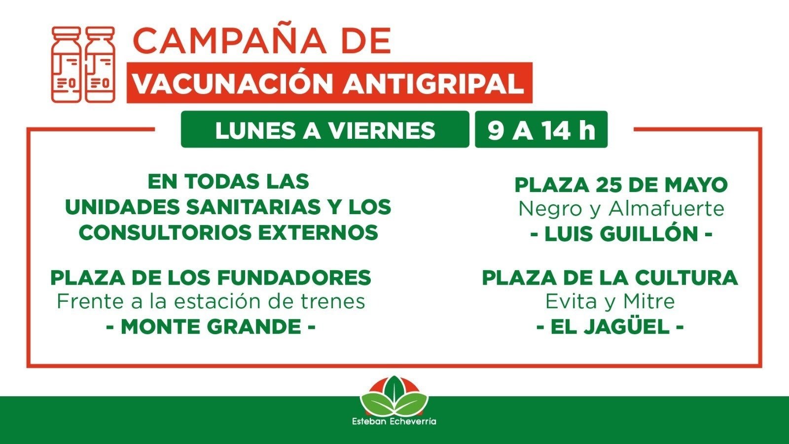El Municipio de Esteban Echeverría avanza con la campaña de vacunación antigripal. Hasta el viernes, de 9 a 14 horas, las vecinas y los vecinos pueden concurrir a: