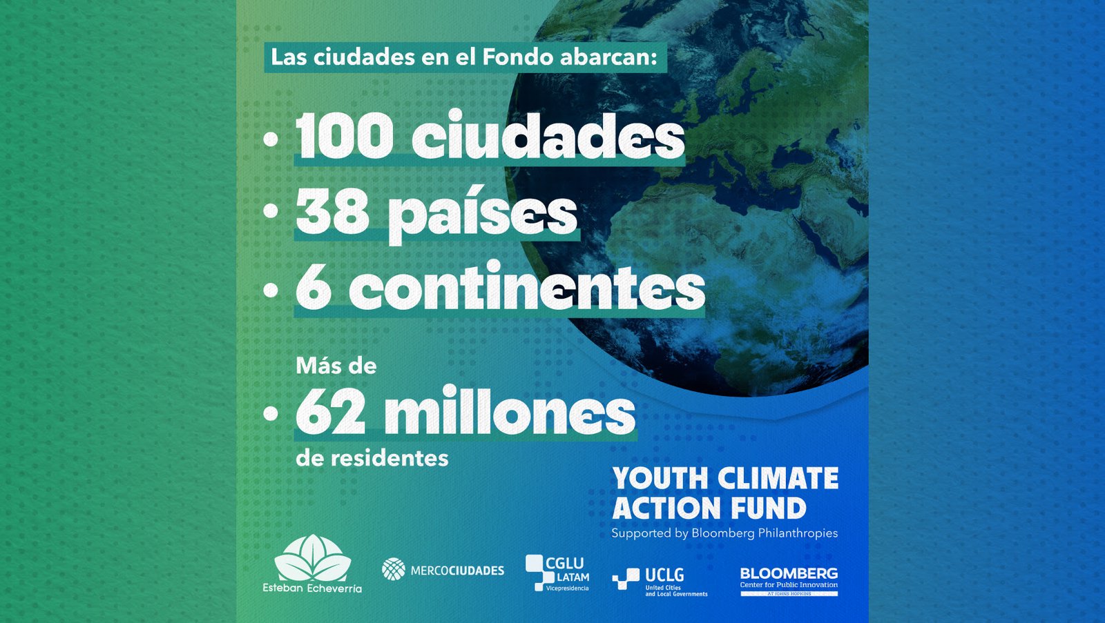 Las 100 ciudades seleccionadas para participar en el Fondo de Juventud y Acción Climática incluyen: Accra, Ghana; Allentown, Pennsylvania; Allerød, Dinamarca; Alor Gajah, Malasia; Atenas, Grecia; Atlanta, Georgia; Avellaneda, Argentina; Banjul, Gambia; Belmopán, Belice; Billund, Dinamarca; Bo, Sierra Leona; Boise, Idaho; Borongan, Filipinas; Bristol, Reino Unido; Condado de Broward, Florida; Bulawayo, Zimbabue; Casablanca, Marruecos; Cerro Navia, Chile; Chefchaouen, Marruecos; Cincinnati, Ohio; Columbia, Carolina del Sur; Columbus, Ohio; Córdoba, Argentina; Cuenca, Ecuador; Curvelo, Brasil; Despeñaderos, Argentina; Dubuque, Iowa; Embu, Kenia; Esteban Echeverría, Argentina; Flint, Michigan; Freetown, Sierra Leona; Glasgow, Reino Unido; Guarulhos, Brasil; Ciudad de Guatemala, Guatemala; Guelph, Canadá; Haderslev, Dinamarca; Halifax, Canadá; Hang Tuah Jaya, Malasia; Hastings-on-Hudson, Nueva York; Hobart, Australia; Hoboken, Nueva Jersey; Valle de Hudson, Nueva York; Irbid, Jordania; Kampala, Uganda; Kerewan, Gambia; Kitchener, Canadá; Kitwe, Zambia; Kumasi, Ghana; La Crosse, Wisconsin; Lansing, Michigan; Long Beach, California; Luján de Cuyo, Argentina; Lusaka, Zambia; Madison, Wisconsin; Madugandí, Panamá; Maipú, Chile; Mansa, Zambia; Ciudad de Masaka, Uganda; Melbourne, Australia; Mendoza, Argentina; Menjez, Líbano; Mesa, Arizona; Mogi das Cruzes, Brasil; Montego Bay, Jamaica; Mykolaiv, Ucrania; Nansana, Uganda; Nueva Orleans, Luisiana; New Westminster, Canadá; Newcastle, Australia; Norddjurs, Dinamarca; Nuakchot, Mauritania; Oakville, Canadá; Oberlin, Ohio; Paterson, Nueva Jersey; Pérez, Argentina; Pikine, Senegal; Puerto Barrios, Guatemala; Quelimane, Mozambique; Quillota, Chile; Recife, Brasil; Reikiavik, Islandia; Rosario, Argentina; San Francisco, Camotes, Cebú, Filipinas; Santiago, Chile; Sekondi-Takoradi, Ghana; Skopje, Macedonia del Norte; Sobral, Brasil; Tandil, Argentina; Blue Mountains, Canadá; Tirana, Albania; Tolhuin, Argentina; Trujillo, Honduras; Turín, Italia; Turku, Finlandia; Vejen, Dinamarca; Walvis Bay, Namibia; West Palm Beach, Florida; West Sacramento, California; White Plains, Nueva York; y Zanzíbar, Tanzania.