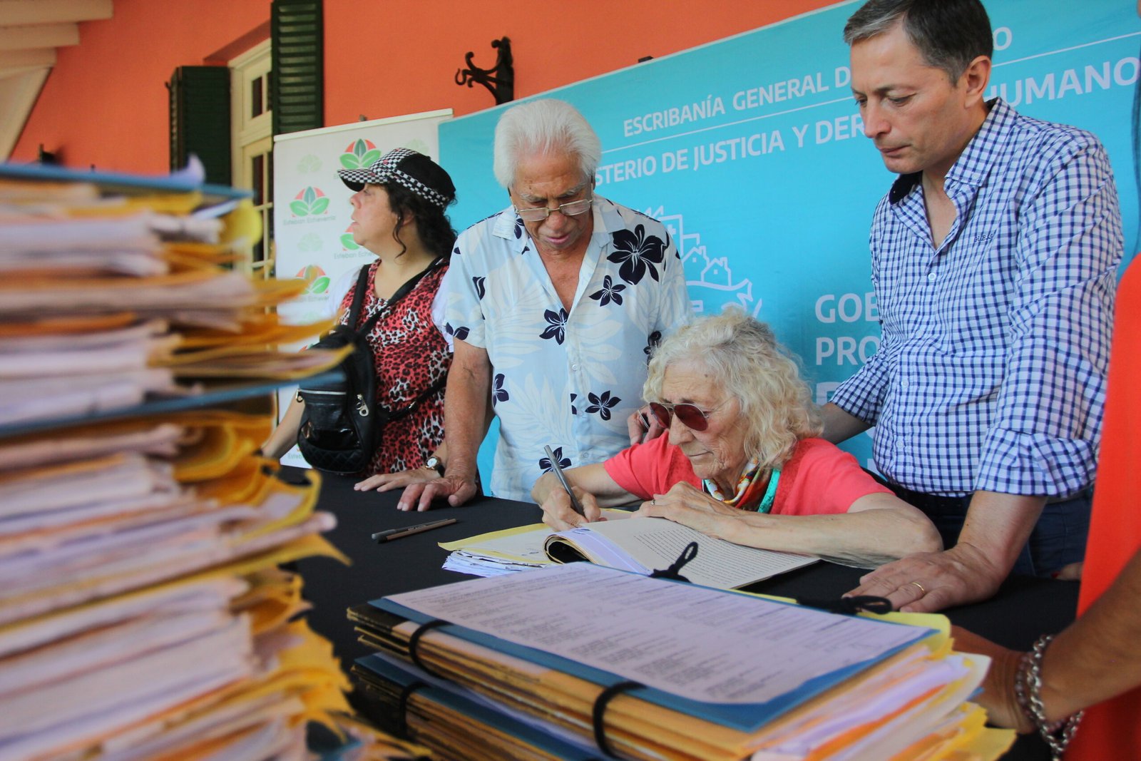 Las escrituras, que corresponden a familias de Monte Grande, Luis Guillón, El Jagüel y 9 de Abril, pertenecen, por un lado, a la escrituración social -herramienta que permite que los sectores de la población con menos recursos accedan gratuitamente al título de propiedad- y, por otro, a escrituras realizadas en el marco de la Ley 24.320 de regulación dominial de prescripción administrativa.