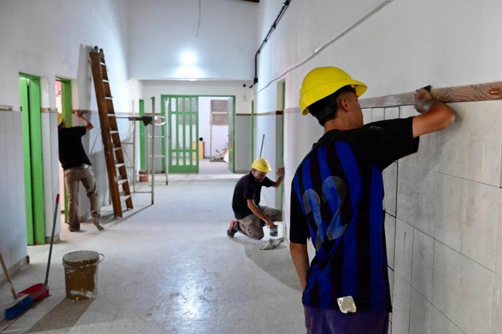 Los trabajos incluyen baños nuevos, las instalaciones sanitarias cloacales y de agua, la colocación de inodoros, mingitorios y bachas, y tareas de pintura. Anteriormente, se realizó el aislamiento y la refacción de los techos.
