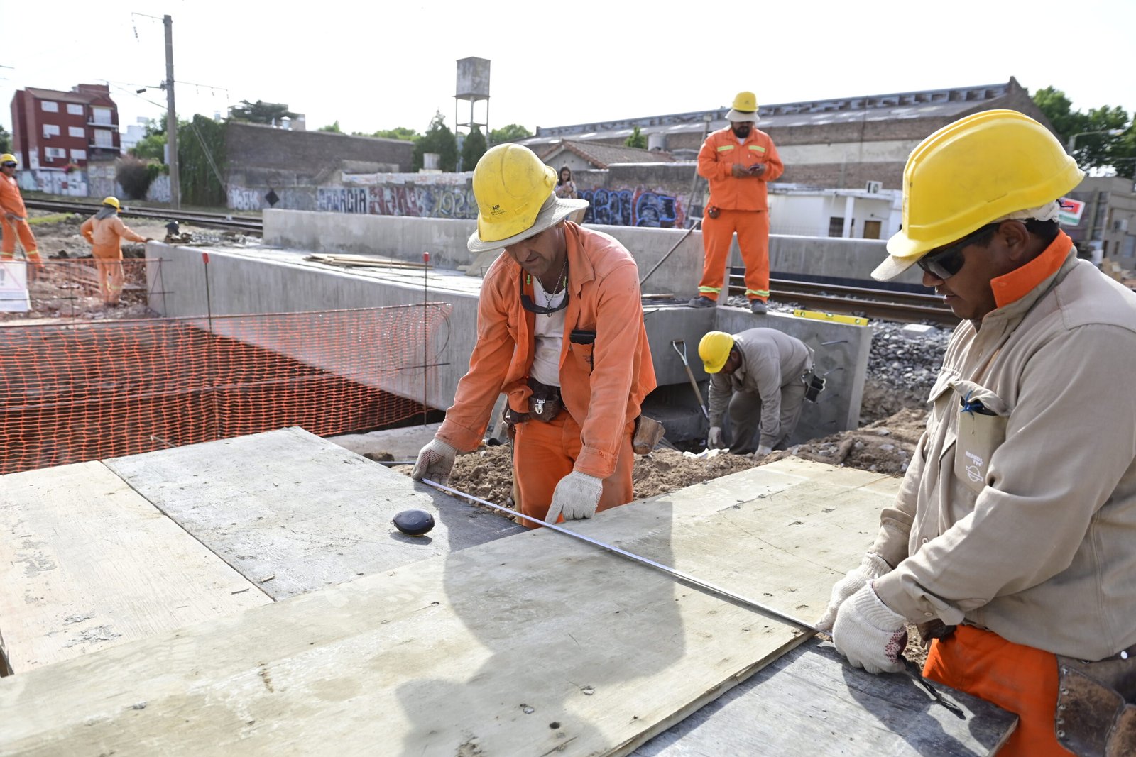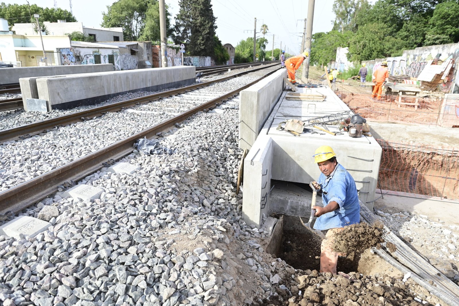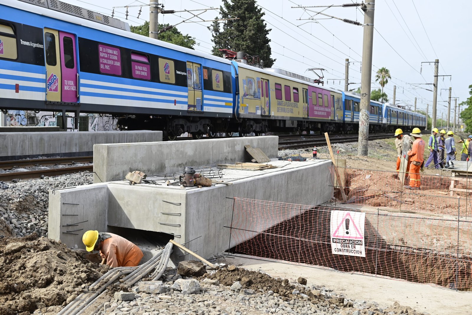 Actualmente, los equipos se encuentran trabajando en la excavación del pozo de bombeo y en la ejecución de la viga canal de desagüe pluvial. En este sentido, ya se concretó un 60% de la obra que contempló tareas de pilotaje, el montaje de los puentes ferroviarios de hormigón y de la armadura del cabezal de apoyo del conducto, el encofrado de la viga cable canal y la colocación de un sector de vías compuesto por rieles, balasto y durmientes nuevos.