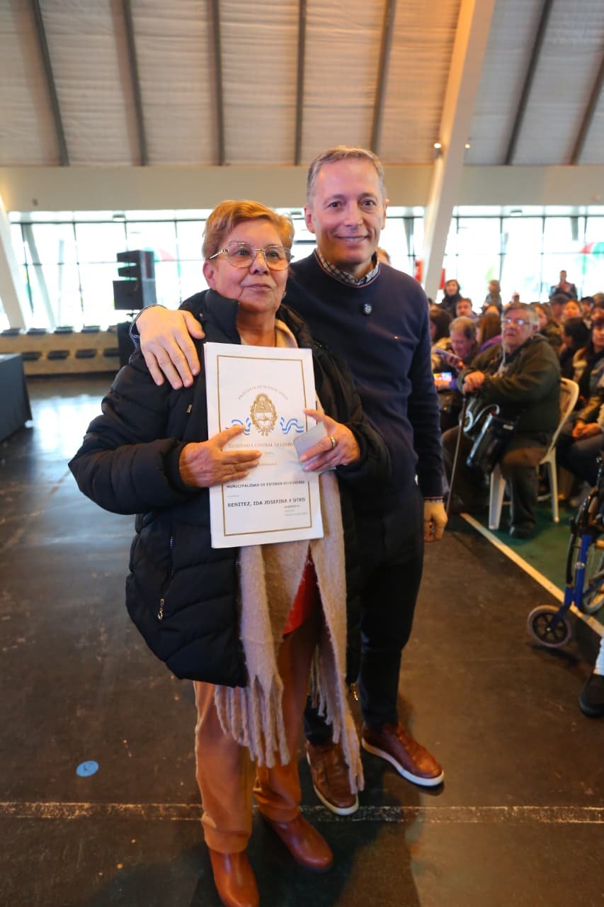 El intendente de Esteban Echeverría, Fernando Gray, junto con Magui Gray, entregaron 1.122 escrituras a vecinas y vecinos del distrito en las instalaciones del Campo Recreativo de Pasteleros (9 de Abril). Esta iniciativa del Municipio garantiza el acceso gratuito al título de propiedad de sus viviendas.