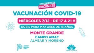 El Municipio de Esteban Echeverría continúa con los operativos de vacunación contra el COVID-19. El miércoles 7 de diciembre, de 17 a 21 horas, las vecinas y los vecinos mayores de 18 años podrán acercarse, sin turno previo, a Campo Amat (Alvear y Moreno, Monte Grande) para aplicarse la dosis correspondiente.